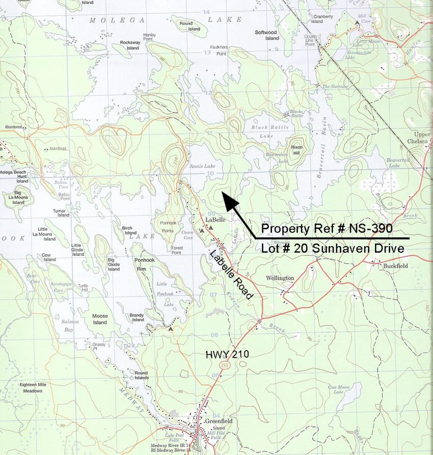 Your land is easily reached throughout the year; a two hour drive from the Halifax International Airport. From the Airport drive south on Highway 102, exiting onto Highway 103 toward Peggys Cove, South Shore, Yarmouth. Continue west on Highway 103 to Bridgewater. At Bridgewater, exit onto HWY 325 and follow west for a short distance to HWY 210. Continue on HWY 102 to Labelle, 22 kilometers distant. At Labelle, turn onto Sunhaven Road and follow for 1.0 kilometers to Lot 20 on the south side of the road. Alternatively, you can reach your lot from the west via HWY 8 to Chapel Hill Drive or HWY 210 to Greenfield. From Greenfield continue on HWY 210 north, turning left on Labelle Road at Wellington. From here continue to your land as above.