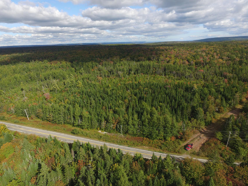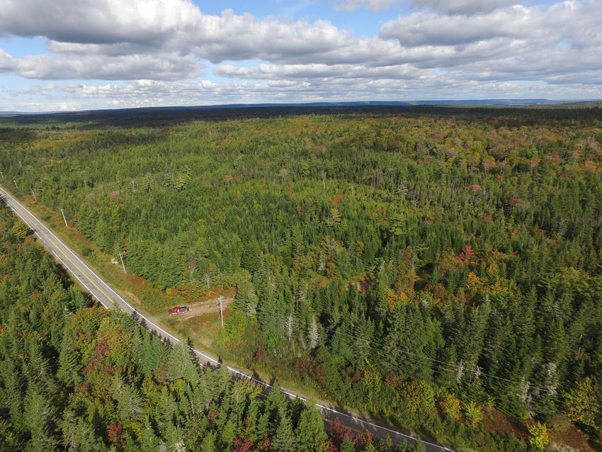 Air photo taken at the south end of the parcel over Highway 4, looking in a northerly direction over the 100 acre parcel. You can see Bras d'Or Lake in the distance!