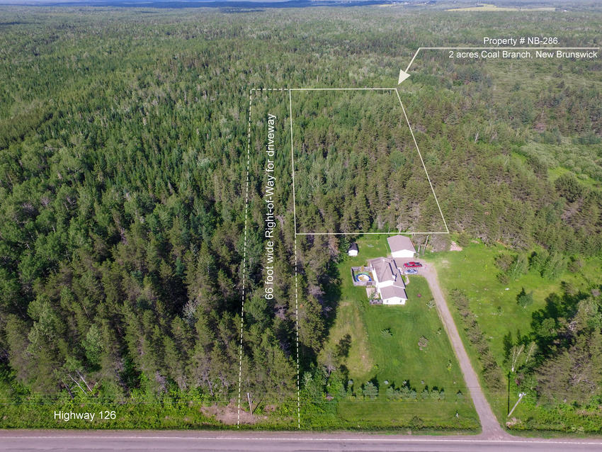 The land sits on the northeast side of Route 126, 226 feet back from the main road. Access is via a 65.6 food wide right-of-way (20 meters) which runs the entire length of the land (see air photo). Route 126 is a well maintained two lane highway running North/South between the cities of Moncton and Miramichi. The right-of-way is currently unimproved and would require construction of a driveway for vehicle access to your land.