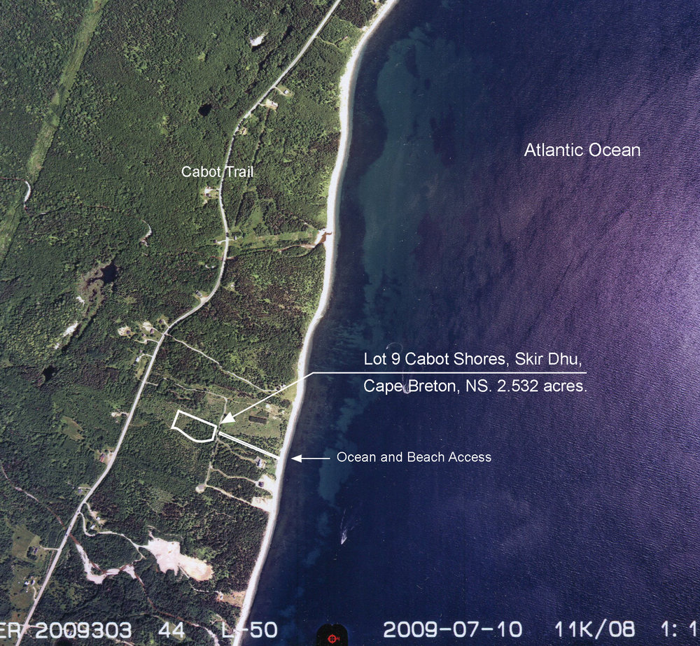 Air photo indicating Lot 9 and the shoreline of the North Shore of Cape Breton along the Cabot Trail.