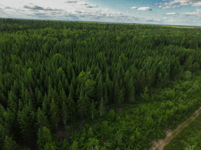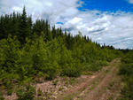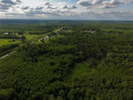 Flying overtop of your land looking down over the evergreen stands. Once again you have a good view of the wood road providing good access through your land.