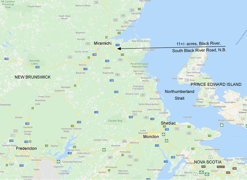 Getting to your land from the Moncton Airport is easy. Take Highway 15 East approx. 15 minutes towards the coastal town of Shediac. Continuing North on Highway 11 approx. 1 hour past Buctouche, Richibucto. Before reaching Miramichi, turn right on South Black River Road and follow East for just a minute or so to your land on the left. Situated beside civic address 115 South Black River Road.