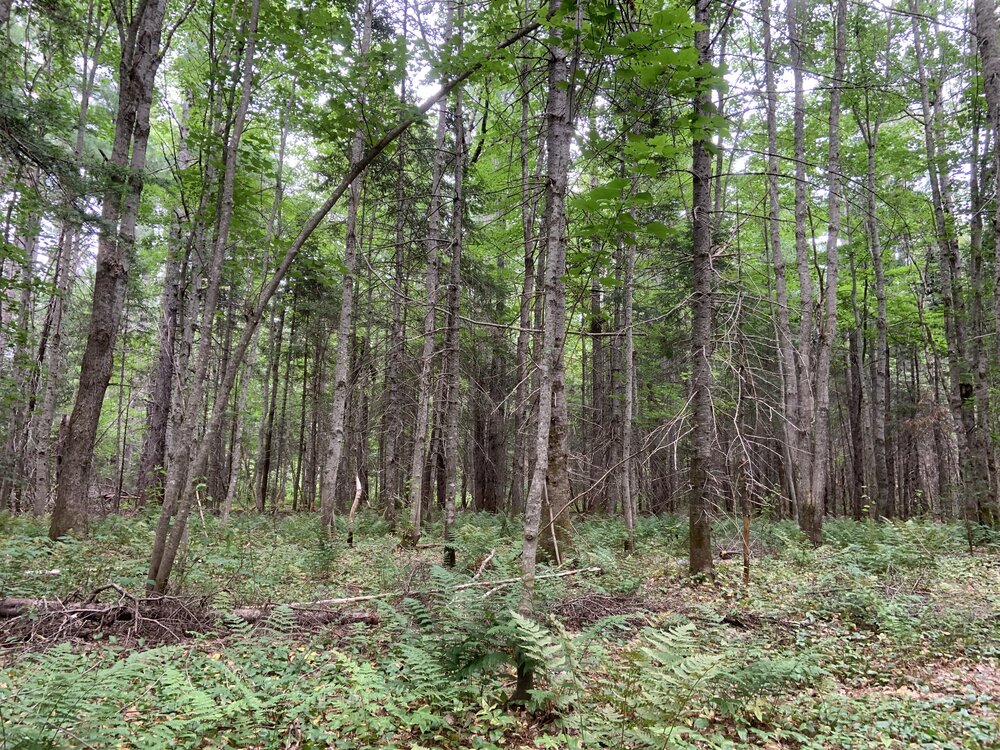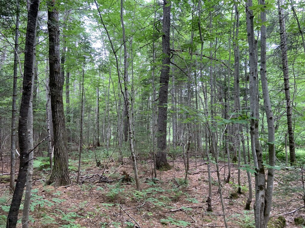 Topography of the land is level at roadside and then sloping down to the river. As you approach the river the land is once again level with a final 3 foot +/- bank to the water. By roadside you have a nice stand of spruce and fir and as you approach the river the forest is mature large evergreen trees with the next generation of spruce and fir beginning to grow up as well.