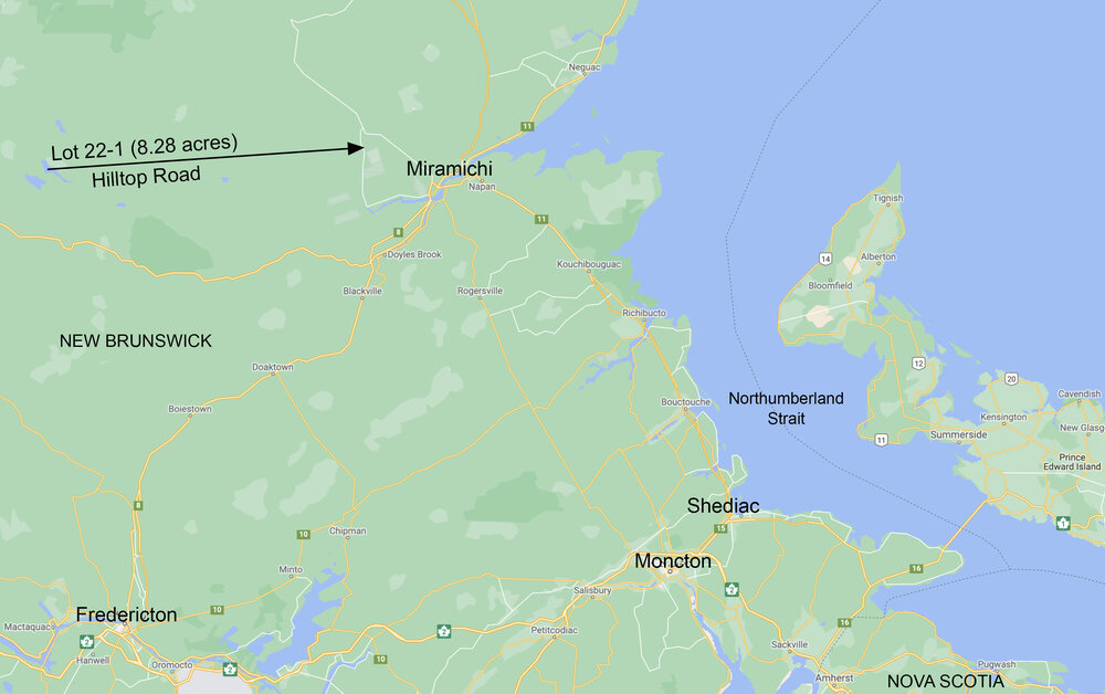 Getting here is easy. From Chatham on New Brunswick HWY 11 cross the Centennial Bridge over the Miramichi River. Take exit 179 for King George Highway West through Miramichi to Newcastle Boulevard North to Highway 430 North. Follow Highway 430 another 10 minutes North (16.3 kilometers) to Hilltop Road on your left. Follow Hilltop Road for about 5 minutes (5.6 kilometers) to your land on the right. The land is immediately after an old red homestead and rustic barn.