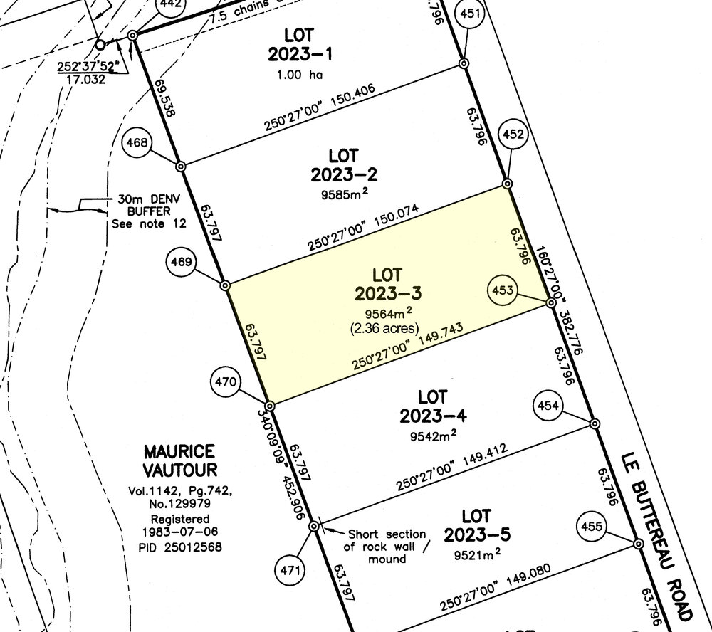 Land located along Le Buttereau Road, at Saint-Ignace, in the Parish of St. Louis, in the County of Kent and Province of New Brunswick. Being Lot 2023-3 on a registered plan of subdivision.