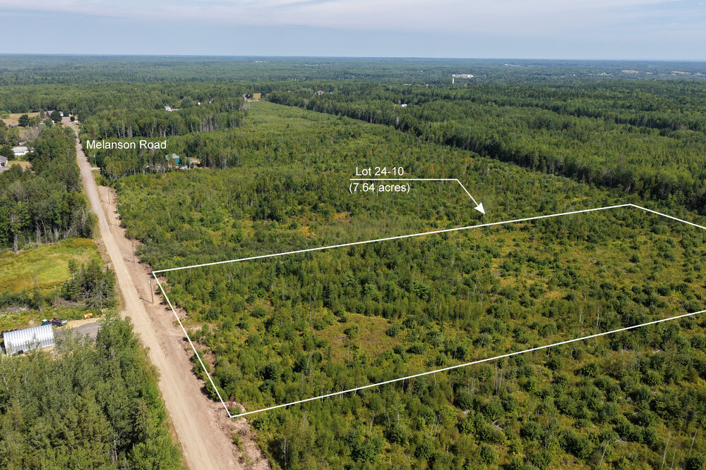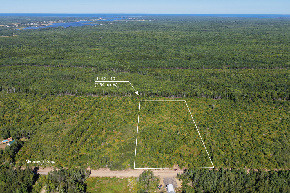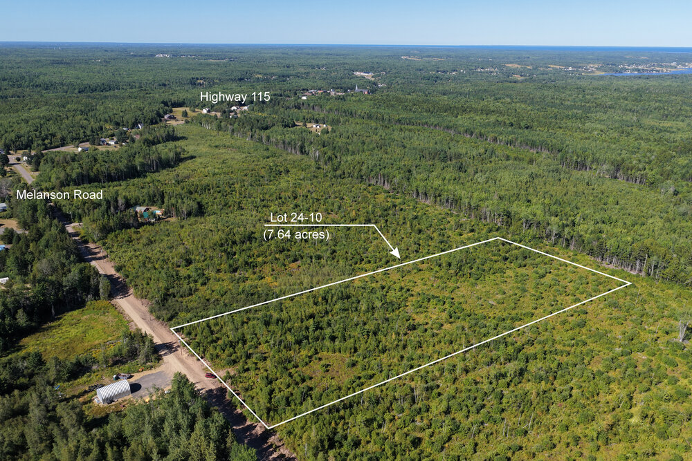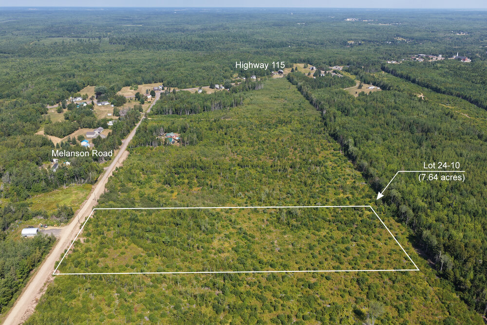 Drone image outlining Lot 24-10 along Melanson Road, looking back towards the main road, Highway 115.