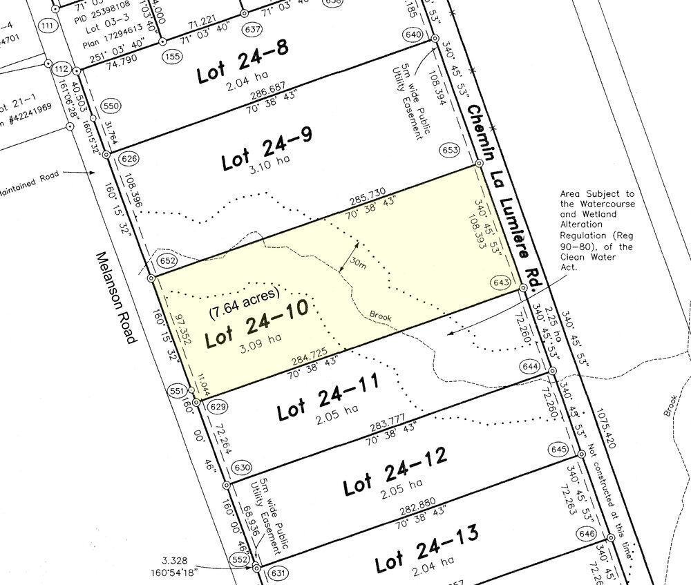 Access is via Melanson Road from Highway 115. Melanson Road is considered a maintained public road for the first 400 meters off HWY 115 and then becomes a non-maintained public road for the remaining road front of Lot 24-9. Continuing south along Melanson Road and you'll find a handful of off-grid homes between here and MacDougall Settlement.