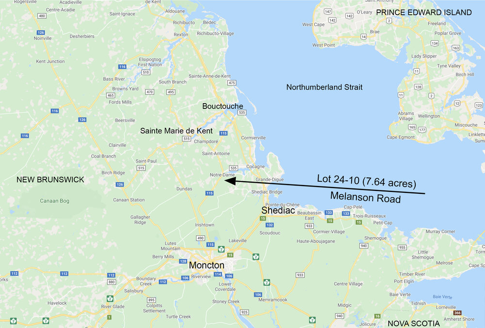 Getting here is easy. From the Trans-Canada Highway (Highway 2) through Moncton, take the Elmwood Drive Exit and head north on Elmwood Drive (Highway 115) past Costco and continue North through Irishtown to Notre-Dame, 2 kilometers or 16 minutes distant. In Notre-Dame right onto Melanson Road and follow for 400 meters to your land on the left side.