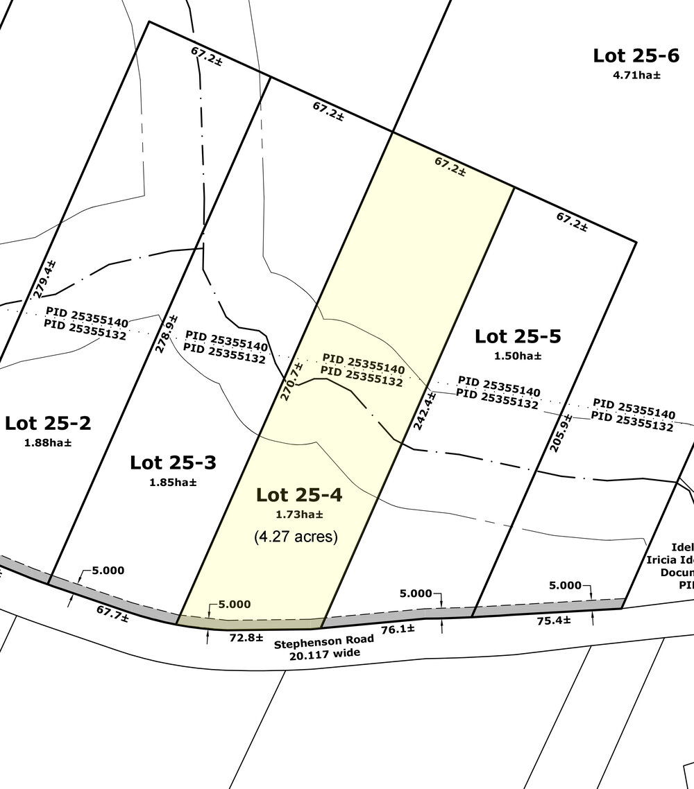Here’s the 2025 survey outlining your property along Stephenson Road, including the boundaries and the brook that winds through the land.