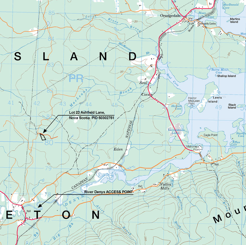 Although the lot does not have any direct river frontage there is a deeded access to the River Denys about a mile and a half away at Riverbend. The river features good Trout fishing. Kayaking and canoeing and small outboards can go right out to the Bras d’Or lake from the water access point.