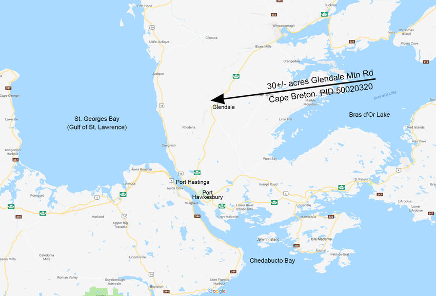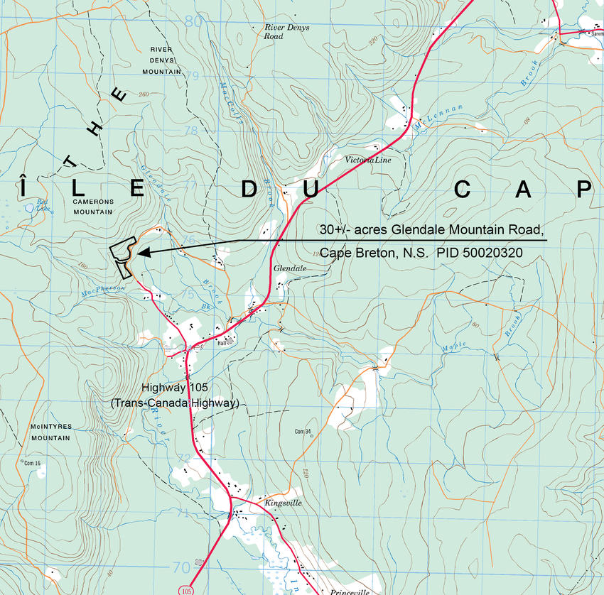 30 acres for sale at Glendale in Cape Breton Island, in the Province of Nova Scotia. This acreage has plenty of road frontage and is a great site for outdoor enthusiasts. Easy access from Highway 105 (Trans Canada Highway) via Glendale Mountain Road. This is a lightly settled area with power close-by. Surrounded by crown lands, forest lands, hilltops and nature. Great hunting and adventure await. --- Sorry this property is SOLD ---