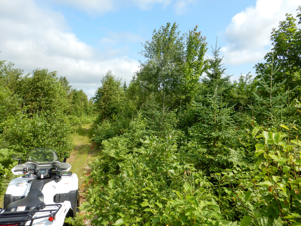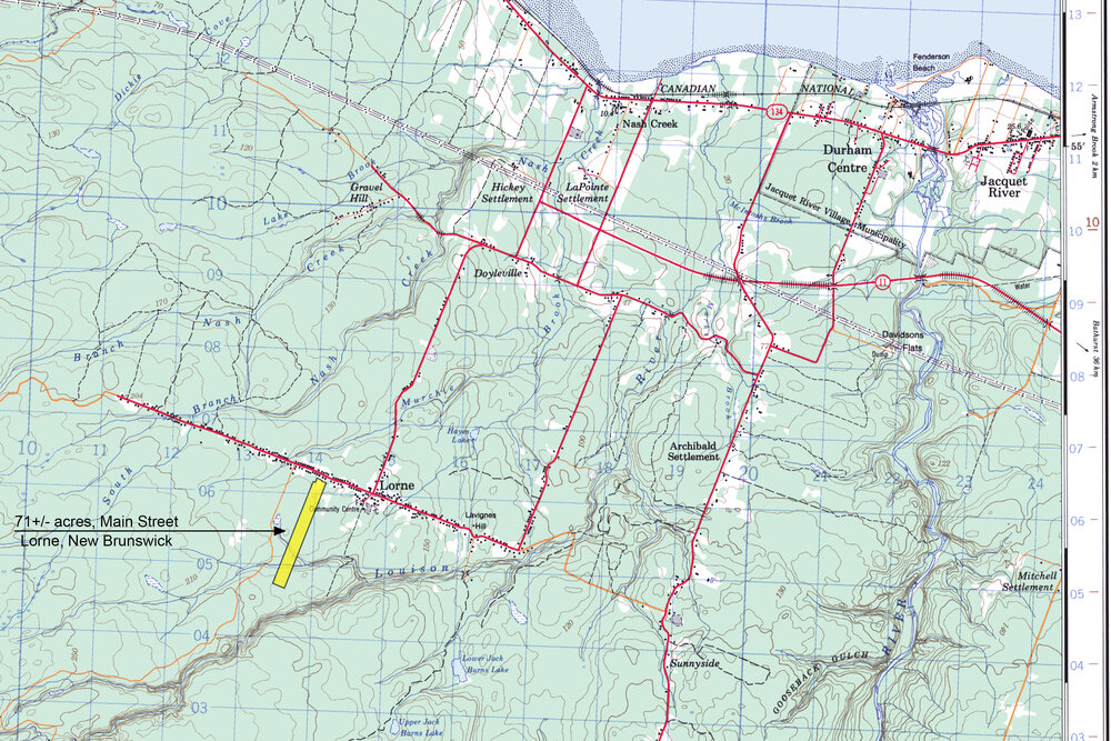 Here is a lovely parcel of land for sale in Northern New Brunswick in the lightly settled community of Lorne. Topography of the land is very generally rising from north to. south averaging 120 meters above sea level at the northern end (by roadside) and up to 150 meters above sea level at the southern end. The land measures approximately 185.9 meters (610 feet) wide, 1,585meters long (5,203.3 feet) and There is roughly 5 acres open field at the north end of the property that we recently had mowed, and all remaining acres of land is treed throughout in maple, birch, poplar, cedar, fir, spruce and pine trees – harvest approximately 15 years ago.