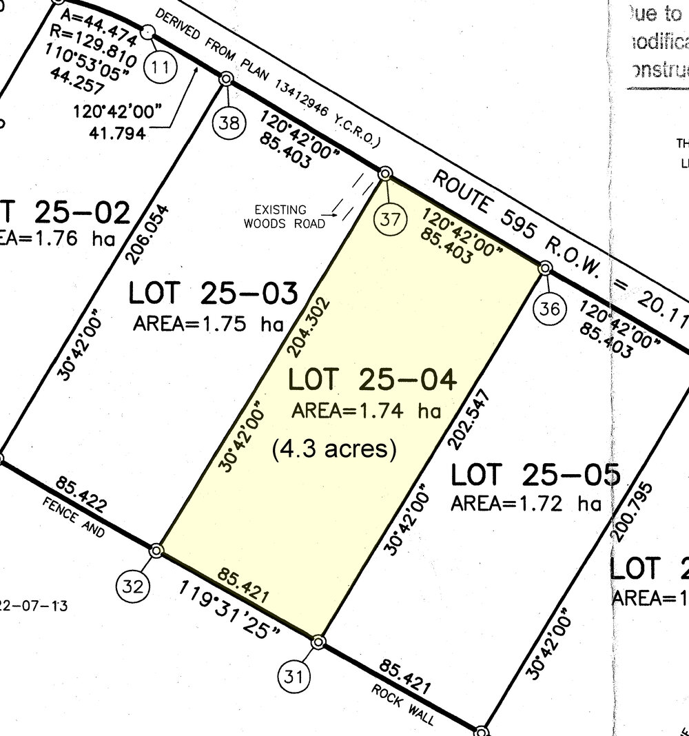 Lot 25-04 (4.3 acres). A land survey was completed in 2025. Measuring 85.4 meters (280 feet) wide by 203.4 meters (667 feet) long.