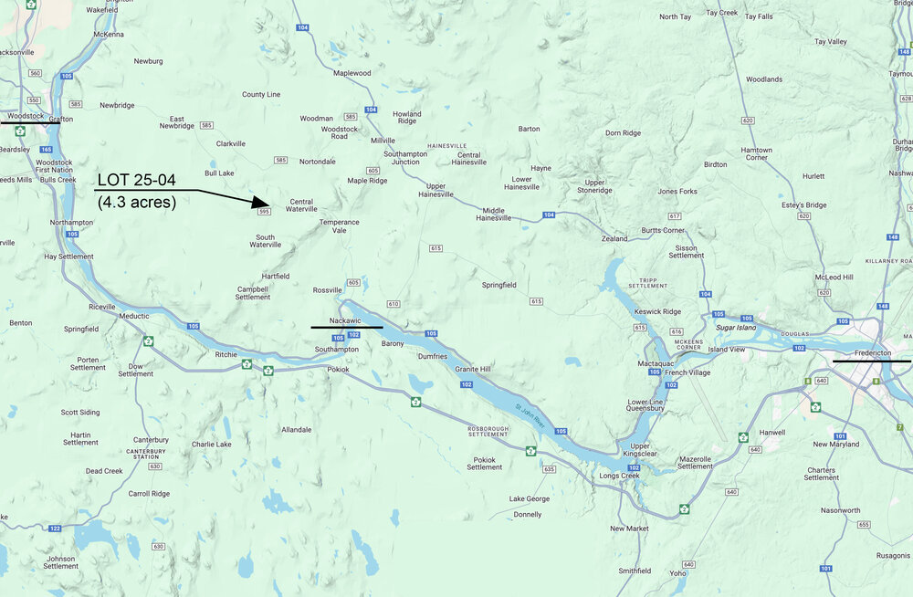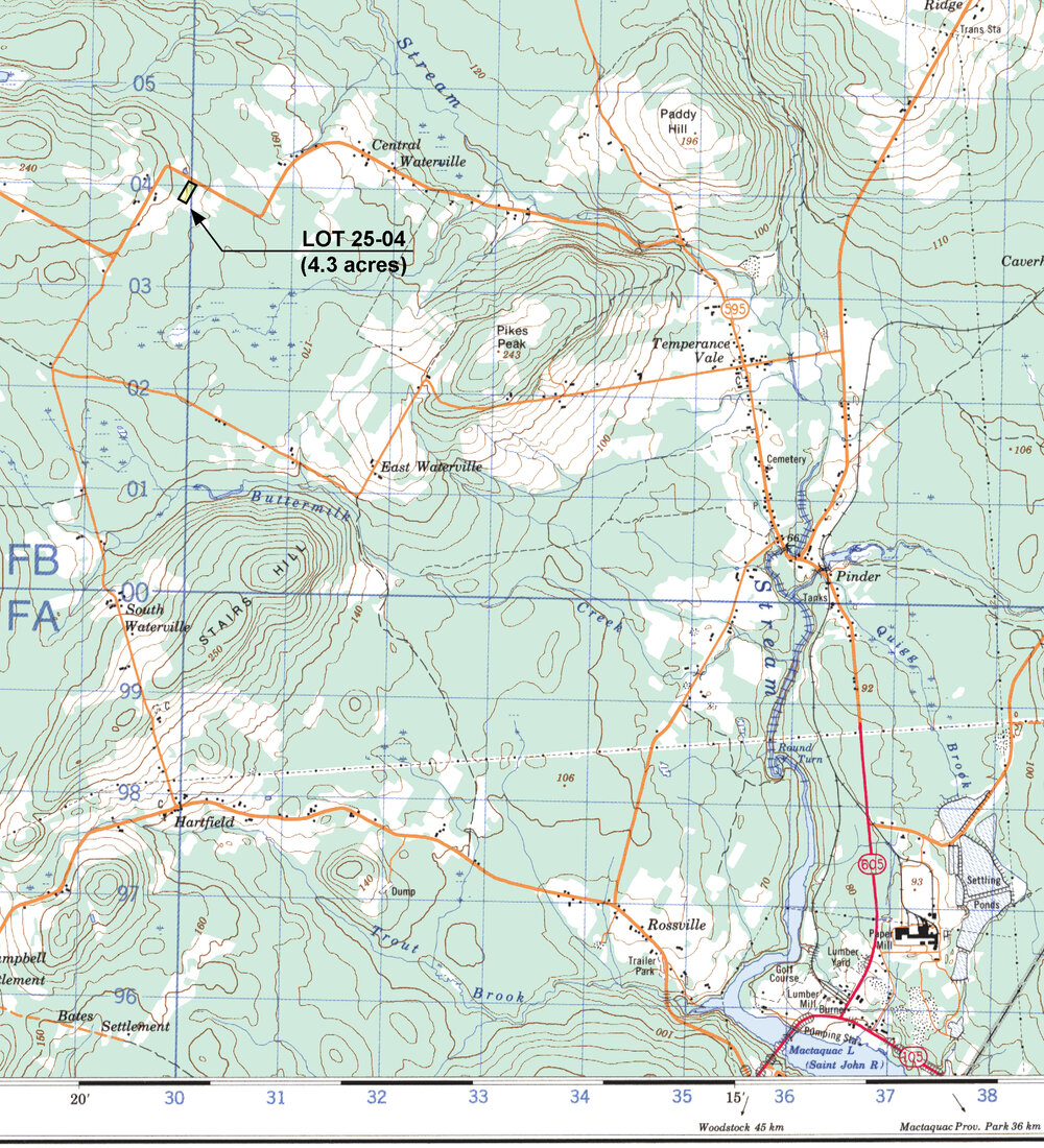 We are pleased to offer this surveyed and approved 4.3 acre lot in Central Waterville, New Brunswick. Lot 25-04 is located along Route 595 – a maintained year-round road providing excellent access. Conveniently located just a short drive north of the community of Temperance Vale and Town of Nackawic, the property is ideal as a rural building lot and land investment in raw land. With no restrictive covenants or requirements to build or improve the property, you can choose to develop the property at your own pace or simply hold onto it as an investment.
